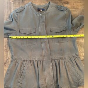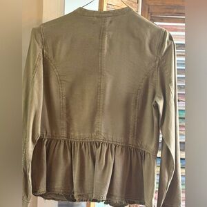 Kaari Blue Olive Green Utility Jacket. In keeping with the military trend, this transitional jacket has the details you expect—a band collar, chest pockets, distressed hem, and a pleated peplum hem that flounces and adds a feminine touch. See pics for measurements. EUC- Size M No known flaws/ straight from cleaners. Smoke Free Home.
