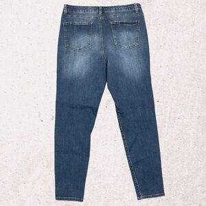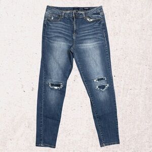 These Kaari Blue skinny jeans feature a medium to dark blue wash with a stylish distressed look, thanks to the prominent rips at knee level. The tapered leg design offers a sleek silhouette, making them a versatile choice for any casual outing.
