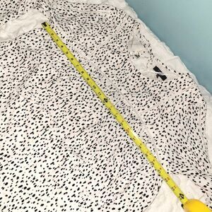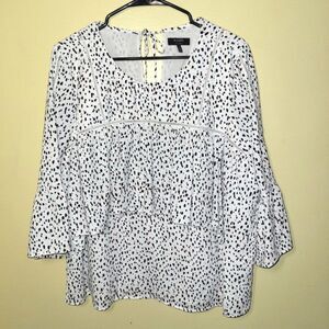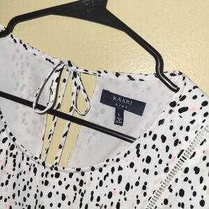 Item: women's spotted blouse with lots of special details throughout, Keyhole style back that ties at neck, cute flared bell sleeves, ruffle layer in front, size large