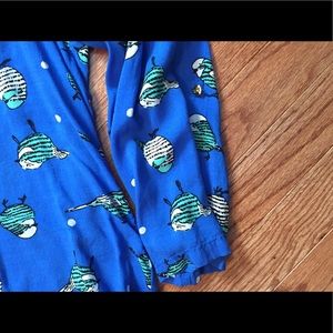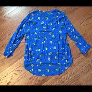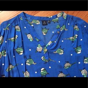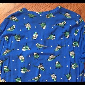 Kaari Blue top with birds, blue and mint green, size Xl. This super cute top is light weight and in excellent condition. It has little buttons on the sleeves, so they can be rolled up a little. Very cute!