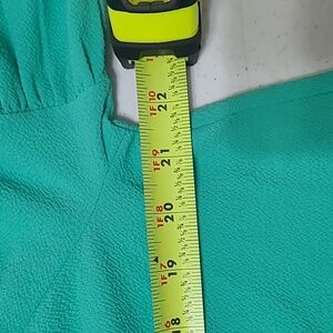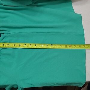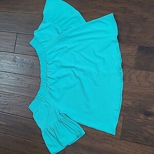 Kaari Blue off-the-shoulder blouse in a vibrant greenish teal color size XL. Features ruffled sleeves for a chic look. Has a small keyhole opening in the front.