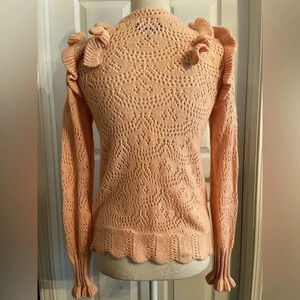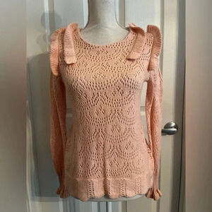 Kaari Blue Pointelle Sweater size XS Color is rose gold.Ruffled shoulders on an open knot design makes this pointelle sweater a fun addition to your wardrobe!