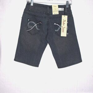 Waist 28", Rise 8", Inseam 10", Five Pockets, Rhinestone Decorated, 95% Cotton, 1% Polyester, 3% Spandex
