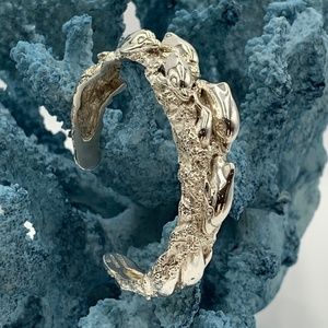This fabulous cuff bracelet is brought to you by the famed jewelers KABANA . They are world renowned for their realistic sea-life jewelry, namely dolphins. This is the ONLY bracelets I have EVER seen that has ELEVEN dolphins in it! Normally, there are maybe 3 to 7. This bracelet is amazingly detailed and was clearly made for someone special. Each dolphin seems to have his/her own personality as they jump through the crashing waves. The water and waves have been beautifully depicted with swirling, bubbling patterning carved into the silver. The undercarriage work is done extremely professionally with smooth edging and curvaceous finishing. The craftsmanship on this piece was clearly done by a master silversmith. I have been in the haute jewelry business over 30 years. For a piece of silver, this is top notch. I was highly impressed by this bracelet. This bracelet has been professionally cleaned and is free from any black tarnishing. It will come to you in a tarnish resisting storage bag.