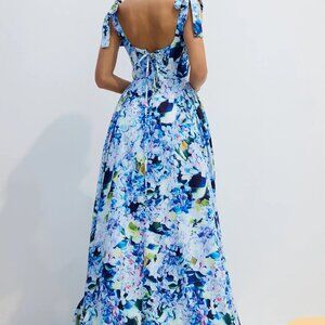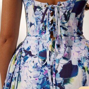 Fitted Bodice, Bow Straps, Lace-up, Blue Floral Print, Midi Length.