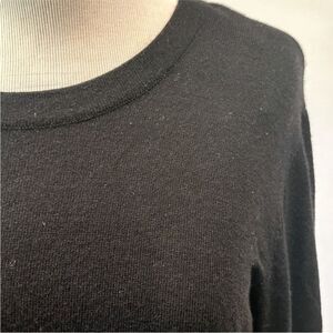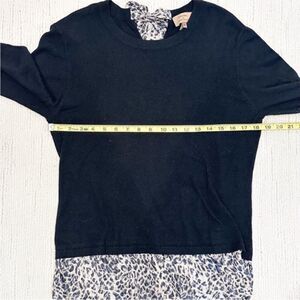 Elevate your wardrobe with this beautiful Kachel x Anthropologie wool blend tight-knit sweater. This black pullover features a leopard patterned chiffon ruffle at hem and sleeve that is perfect for any occasion, from workwear to casual outings to travel. The crew neck and chiffon leopard bow tie closure and keyhole add a touch of sophistication and playfulness, while the long sleeves and wool blend material make it suitable for all seasons. Main: 60% Viscose, 35% Nylon, 5% Cashmere. Trim: 100% Viscose. Like new with no visible flaws.