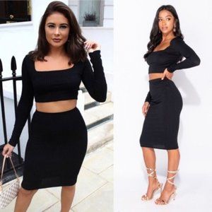 Kacy Black Rib Knit Crop Top & Midi Skirt Set