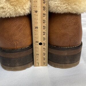 Kadi Maya brown synthetic leather booties with cute faux fur cuffs and lining. Metallic zipper detail along outer side of each shoe.
