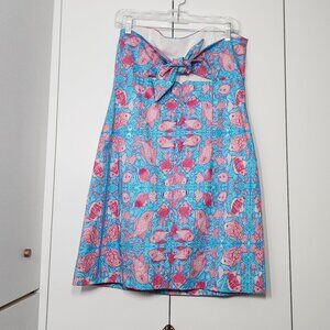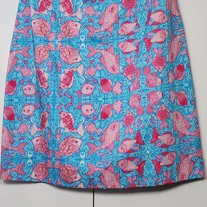 This dress features a strapless A-line silhouette, aquatic-themed pattern featuring pink and red fish, coral, and waves on a bright turquoise blue background, decorative bow and small cutout at the upper back, back zipper, fitted bodice with a gentle flare starting at the waist, flattering a variety of body types.