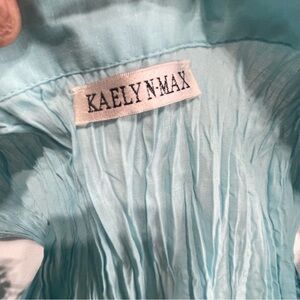 This is a pre-owned blue sleeveless top by Kaelyn Max. It is size XL and made of 65% polyester and 35% cotton. The top has a collared neckline with a decorative ruffle detail. It features a zipper closure up the side. There is also a small front closure. The top is in great condition with no visible signs of wear or damage. The fabric is soft and has a slightly wrinkled texture.