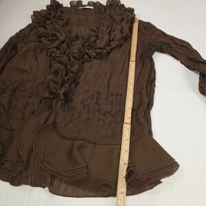Kaelyn Max Womens Medium Blouse Sheer Brown Regency Peasant Ren Fair Artsy Boho. In good, pre-owned condition with no noted rips, tears or stains. Material is sheer and has a crinkled appearance. Missing Size, Materials and care tags. Appears to be Medium or Large by measurements. Measurements in description and in pictures with ruler. Please see pictures as they are considered part of the description.