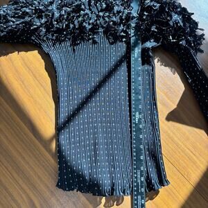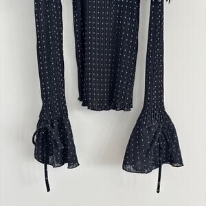 off-the-shoulder blouse with textured ruffle details. bell sleeves with ties. dotted black and white pattern. semi-sheer. size extra large, stretchy.