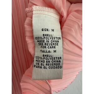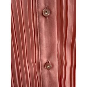 Add a pop of color and texture to your wardrobe with this stunning pink blouse by Kaelyn-Max. This women’s size medium button-down top features intricate vertical pleats and sheer mesh sleeves adorned with sequin and bead detailing. The wide statement cuffs and structured collar give it an elegant, fashion-forward look—perfect for both work and a night out.