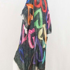 Showroom floor sample, cute hearts kaftan with wide arms 10" opening, 40" length and 40" width, can be worn with a belt or loose as shown, natural fringed edge, stitched down the side with the 10" arm opening for comfortable fit, black background with assorted hearts, 100% lightweight wool, soft feel.