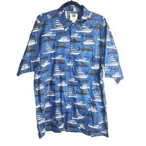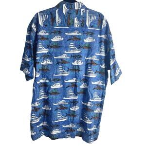 Kahala Hawaiian Islands Shirt Men's XL Blue Boat Swordfish 100% Cotton (D472)