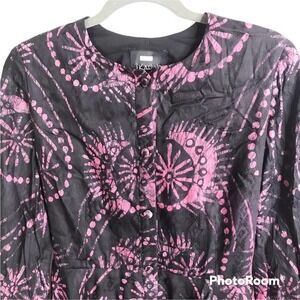 Kahindo Mara tie dye dress. Black and red tie-dye cotton. Hourglass. Crew neck. Long sleeves. Front button closure. Red color is similar to a red/purple tone. 3/4 sleeve with elastic wrist cuffs. Balloon sleeves. Full skirt. Cut out back detail.