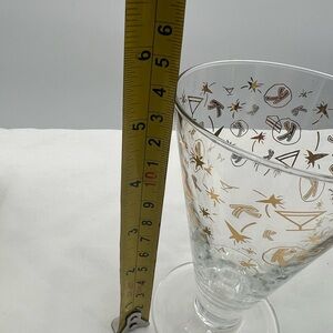 MCM cocktail glasses with adorable gold print on the glasses of rockets, coctail glasses, slice of cake, and the letter K.