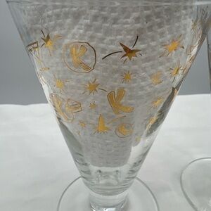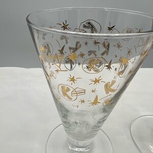 MCM cocktail glasses with adorable gold print on the glasses of rockets, coctail glasses, slice of cake, and the letter K.