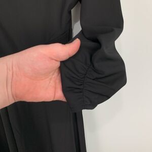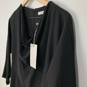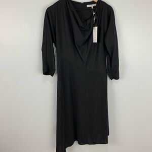 New with tags. Black 3/4 sleeve dress with scoop neck and asymmetrical hemline. Zipper in back of dress. Pit to pit= 17”, shoulder to hem= 40” one side 45” other side, waist= 15.5” across.