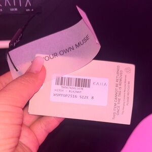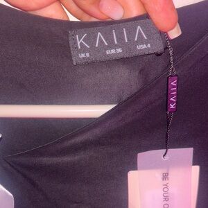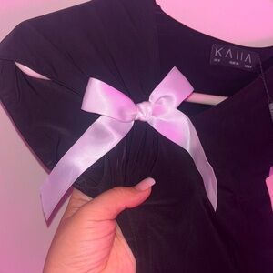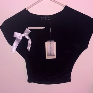 Chic black crop top by Kaii. Features a stylish white accent. Ideal for versatile styling. Super flattering , has a white bow winching o the right shoulder . Stunning ! I unfortunately have a belly and can’t wear this now 😅