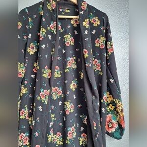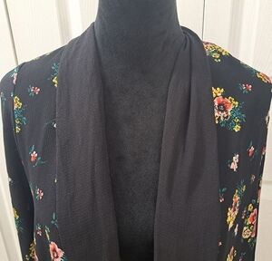 black with multi color flowers, long sleeves, open front, 96% polyester 4% spandex