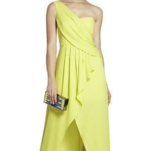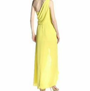 Citron color, high low with sheer like bottom, perfect for a spring or summer wedding!