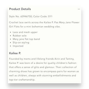 These flats are of excellent quality with a synthetic outsole material and minimal cushioning level. The Kailee P Pas flower girl product line by Anthropologie is an imported product of lace and upper mesh materials with fabric lining and synthetic insole material. The shoe width is R with a flat heel style, perfect for walking activities.