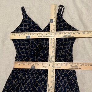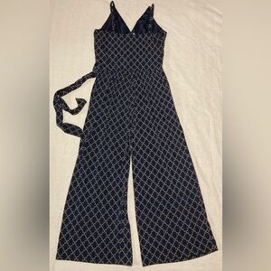 Embrace elegance with this Kaileigh jumpsuit, featuring a striking cream and blue geometric design. The wide-leg silhouette and matching fabric belt create a flattering fit, making it perfect for both casual and formal occasions. Elevate your style with this versatile and chic piece.