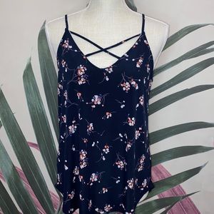 Straps criss cross in the back but this top can easily be turned so that straps cross in front