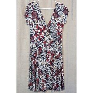 The Kaileigh Floral Faux Wrap Dress in Navy Red, size Large, is a whimsical and dark fairy-inspired piece perfect for various occasions such as travel, weddings, parties, or even casual workwear. This knee-length A-line dress features a V-neck neckline, short cap sleeves, and a pullover closure for easy wear. Made from a polyester blend knit fabric with a stretch feature, this multicolor dress is machine washable for convenience. The floral pattern and faux wrap accents add a touch of elegance to this dress, making it a versatile and stylish choice for the modern woman.