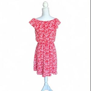 Stitch Fix NWOT Kaileigh Rebecca Floral Dress with Flutter Sleeves. Coral color. Size XSP. Slight off the shoulder fit. Elastic waistband with tie belt. Lined.