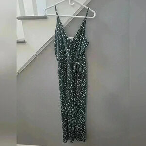 This is a Jumpsuit that you can step into...easy on and easy off. It is a forest green background with tiny white flowers and the flowers have little pink center. There is elastic at the waist line with a wrap around tie on the hip. Spaghetti straps with a mock wrap look boudica. Two Pockets...yes!!! it has pockets!!! The legs of the pant portion are cut in a full flowing cut. This is a fun jumpsuit...great for this coming fall or one of those vacation to beach land this winter.