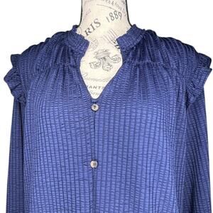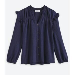 A versatile knit top from Stitch Fix with feminine ruffle details at the shoulders, a flattering v-neckline, and button-front style. The soft stretch fabric in classic navy makes it easy to dress up or down, perfect for both workwear and everyday style.