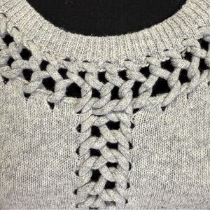 Cozy gray knit sweater with elegant crochet details. Ideal for layering.