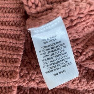 Kaisley Cable Knit Wool Blend Crewneck Sweater Size Large in excellent pre-loved condition. It is a gorgeous soft salmon color. This sweater feels great and is a chunkier knit without being bulky. Has a great bold cable-knit and ribbed neckline, hem and cuffs. Super cute and comfy! Laying flat underarm to underarm is approximately 19”inches and from top to bottom 23” inches!