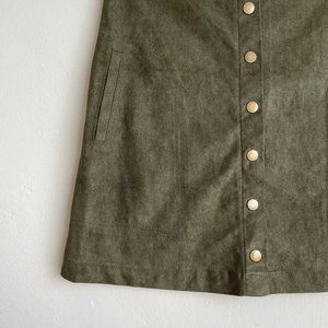 Forest green color, velvet like smooth material, a-line skirt with buttons down the front. High waisted, mini skirt style.