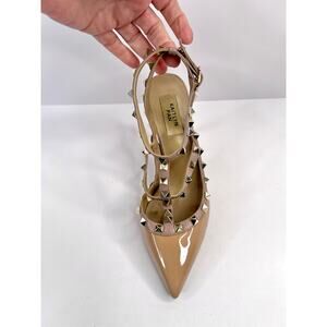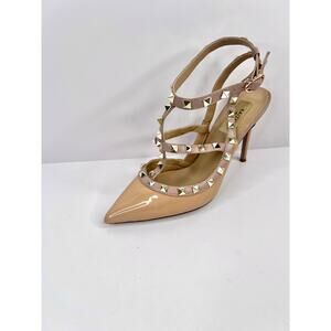 Kaitlyn Pan Size 5.5 (EU 36) Rockstud Leather Pointed Toe Patent Leather Stiletto Heels Tan and Pink