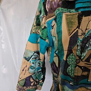 This gorgeous Kaktus wearable-art jacket features an abstract Picasso-inspired faces print in teal, green, beige, black, and purple tones. Lightweight, soft woven fabric with a button-front closure and 3/4 sleeves. A true statement piece for anyone who loves boho, eclectic, or gallery-style fashion.