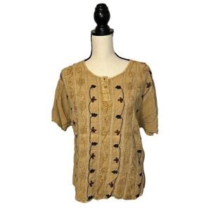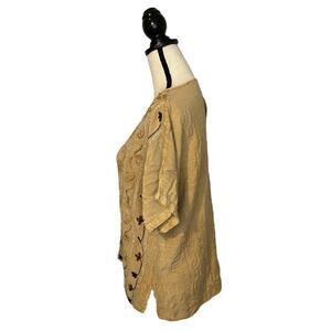 Kaktus Button Up Top Womans Large Floral Appliqué Beige 3/4 Sleeve Causal Top