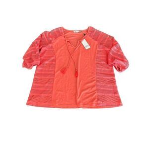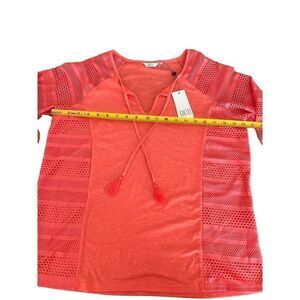 New with tag! Ideal for this summer. Casually comfortable, this top by Kaktus features 3/4 sleeves with a mesh look, tassle strings by the neck, round neckline, and textured solid look with mesh down the sides. Cotton. Polyester. Spandex.
