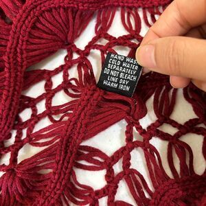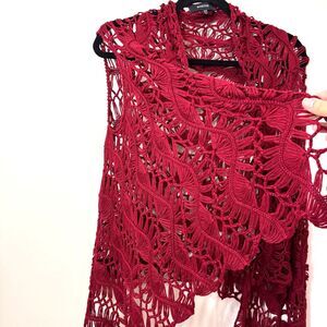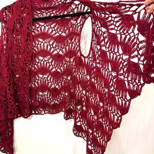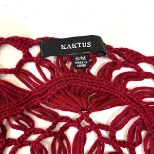 Features: Kaktus Red Open Knit Crochet Kimono Shrug. Sleeveless. Gorgeous crochet details. Tassels at the neckline. Relaxed loose fit, great hippie vibes.