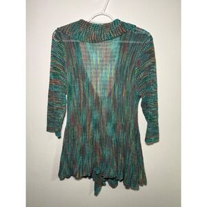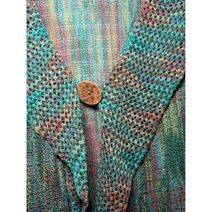 Keywords: multicolor knit, open front, button detail, 3/4 sleeve, lightweight, boho, casual, layering piece, textured, acrylic blend, summer knit, resort wear, bohemian, festival, artsy, lagenlook