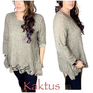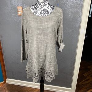 Charcoal Gray Tunic with crew neck. Unique handkerchief hem at the front. Lining in the front. Lace and mesh trim at bottom and on side panels. Long sleeves with roll tabs to adjust. Body: 100% Cotton Lace: 52% Nylon, 40% Cotton, 6% Rayon, 2% Spandex Lining: is 96% Rayon, 4% Spandex Size Large.