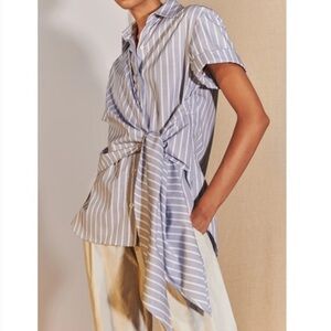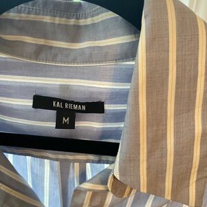 Never worn, no tags short sleeve button down from Kal Rieman. Light blue, yellow and white stripes. Large front tie looks great knotted or in a bow.