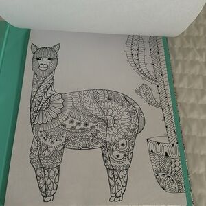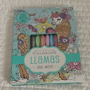 Colorful llama-themed coloring book with pastel markers. Features vibrant floral designs.