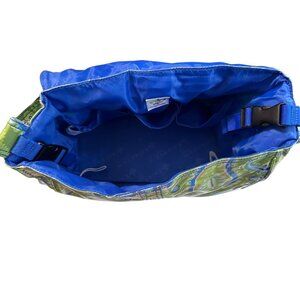 Think a diaper bag has to be frumpy and blah? Not with this beauty! This Kalencom green and blue paisley diaper bag is bright and beautiful. It has space for baby's things and a few items for mom and dad or an older sibling, too. Solid construction, no rips or tears, and a great wipeable surface keeps it looking clean all the time. The carry strap is adjustable to different lengths, the outside had two magnetic side pockets, and the main flap is magnetic. The inside of the bag has three pockets, two white elastic bands, and two black clips to hold all your important smaller items. This bag comes with a wetbag and a blue changing mat, neither of which were used. You and baby will be ready to hit the road with this bag.