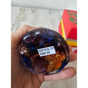 stands about 4.5 in tall by 3 in by 3.5 in, comes with its original box but moderate damage on the box and missing the inserts, Crystal is in excellent condition, new in the box, never used