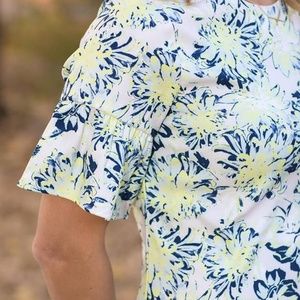 White dress with ruffled hi/low bottom and ruffled sleeves. Light green & blue flowers