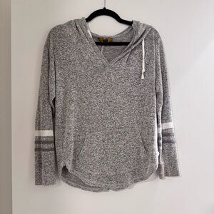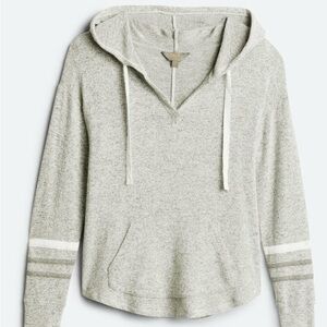 A cozy brushed knit hoodie with sporty striped sleeve detail and adjustable drawstrings. Lightweight, soft, and perfect for layering through the seasons. Actual shade is a slightly darker grey than shown in the stock photo.