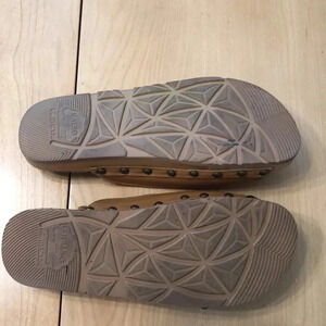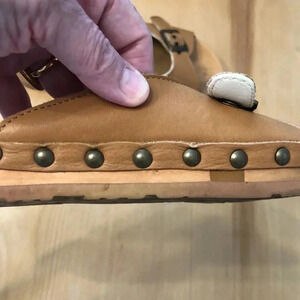Kalso Serenity negative heel leather Earth sandal. Cognac leather with adjustable buckle closure. Wooden footbed with synthetic outsole. Size 7.